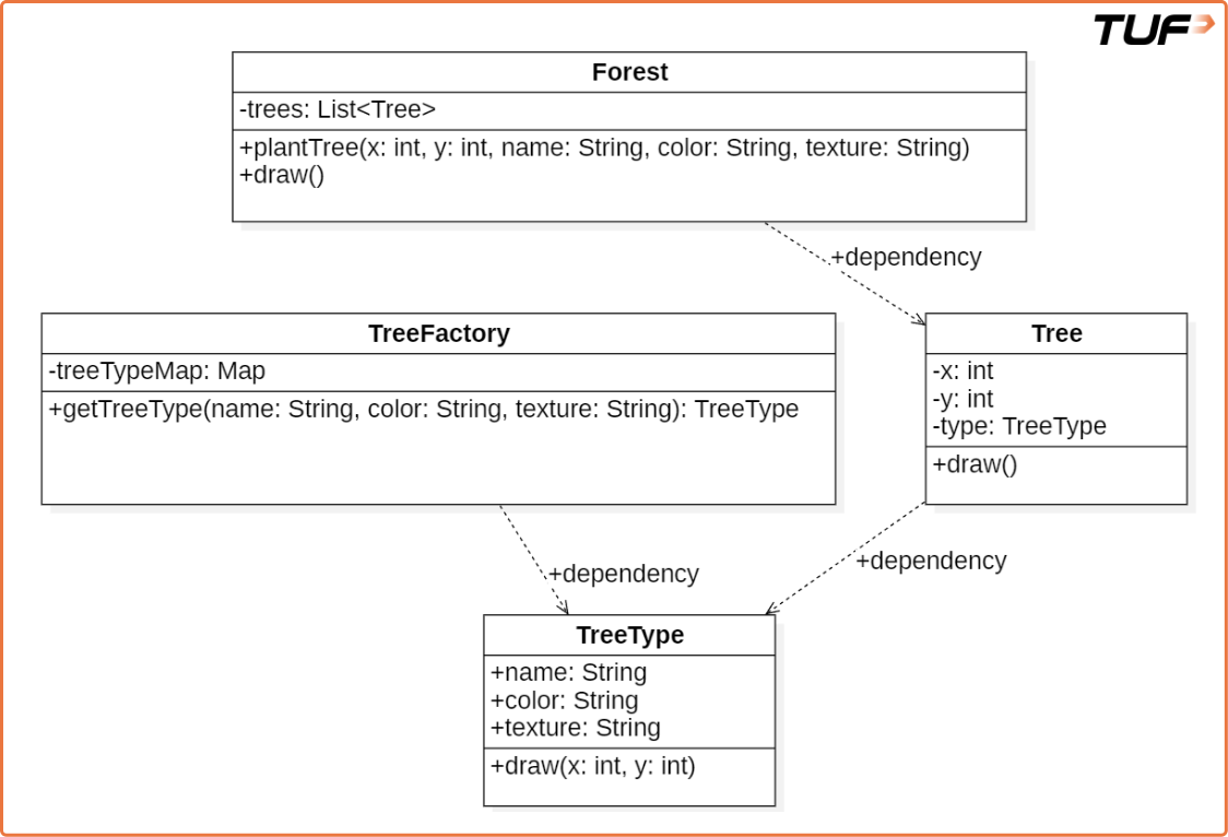 * **Memory Efficiency:** Even with **1 million trees**, if they all share the same TreeType ("Oak", "Green", "Rough"), **only one TreeType object is created** and shared across all trees, reducing memory usage **dramatically**.